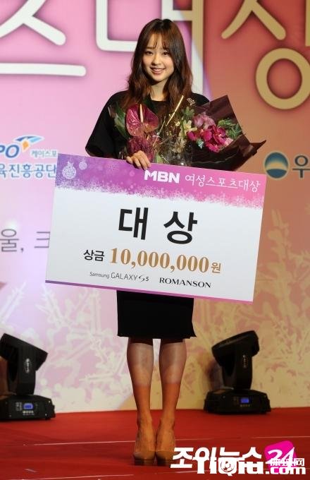 北京时间2014年12月23日消息,韩国艺术体操美女孙妍在当天在首尔市小公洞乐天酒店举行的“2014年度MBN电视台女体育人”奖的颁奖典礼。今年获得了仁川亚运会艺术体操个人全能项目金牌的孙妍在获得了最佳女运动员的称号,她表示会把主办方授予的1000万韩元(约5.6万元人民币)全部捐作慈善用途。