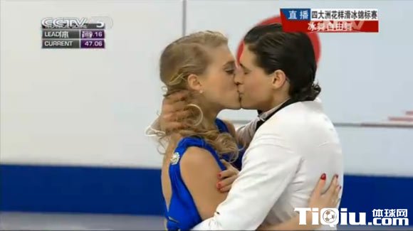 加拿大组合吉乐斯/波伊瑞尔整套动作表现堪称完美,最大的看点来自结束动作,两人拥抱在一起深情一吻。而随后在等分的时候,视频转播信号抓拍到了男伴波伊瑞尔脸颊上满是口红印的一幕。