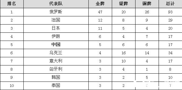 【导读】第二届武搏会结束各个单项的较量,中国以中国5金6银6铜位列奖牌榜第五位。东道主俄罗斯队则是以47金20银26铜独占鳌头。法国队12金8银9铜尾随其后。