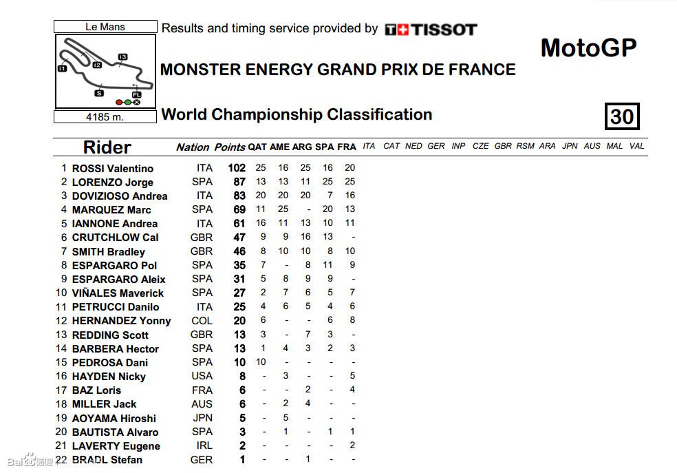 勒芒站之后,罗西以102分的总积分高居车手榜榜首,洛伦佐87分继续排名第2。罗西在第四圈做出1分32秒879的最快单圈,全场平均时速达到162.2KM/H。勒芒站的最快单圈纪录是由马奎兹在2014赛季创造的1分32秒042,但很遗憾马奎兹此次并没能站上领奖台。