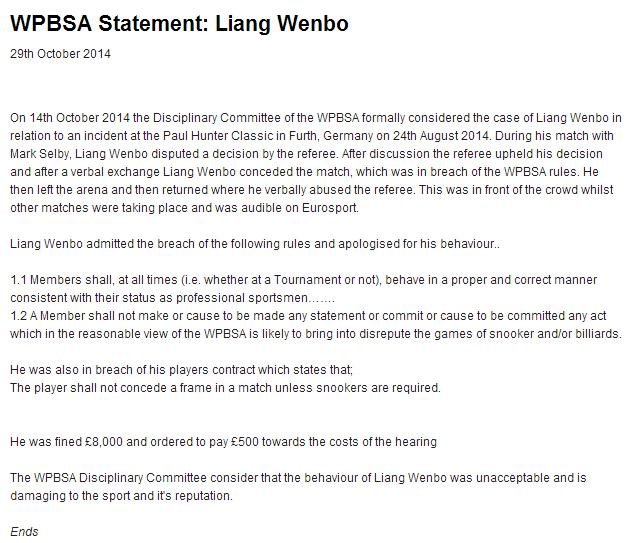 综合体育 时间:2014-10-31 11:52来源:未知编辑:Jun【导读】梁文博在比赛过程中辱骂裁判,最后更是选择退赛这样激烈的行为,影响了在场观众,不符合斯诺克的运动精神。最终,世界台联纪律委员会认为梁文博的行为是不可接受与容忍的。