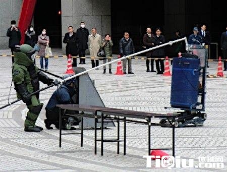 之后,日本警视厅爆炸物处理班的成员出动,通过远程操控机器人把遗留在现场的包移至空旷处,身穿防护服的防暴警察用伸缩臂将包放入专用容器中。