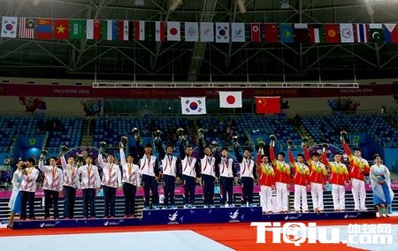 2014年9月21日, 仁川亚运会体操男团决赛。中国队以350.300分获得铜牌,日本队以353.775分获得金牌,韩国以350.375分获得银牌。