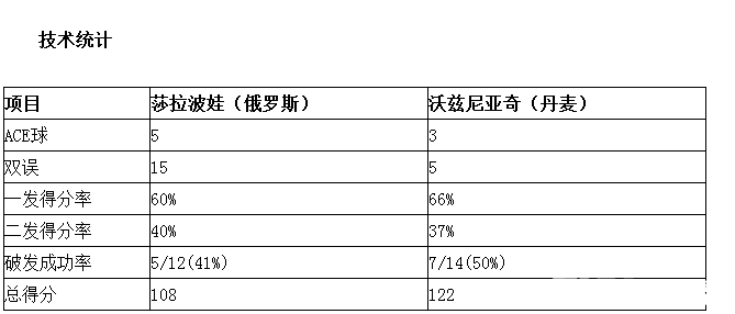 莎拉波娃今日在ACE球的数量上以5-3领先,但是双误15-5是对手的整整三倍,一发得分率和二发得分率两人基本上不相上下,莎拉波娃全场比赛完成了5次破发,而沃兹尼亚奇则在14个破发点上7次破发成功,总得分上莎拉波娃以108-122落后。