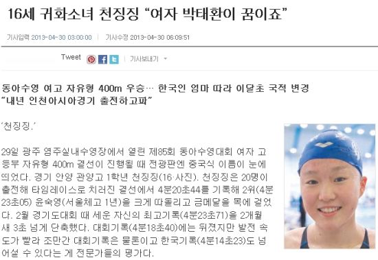 这篇文章援引韩国的报道说,16岁的归化少女千晶晶在第85届东亚游泳大会上获得了女子400米的冠军。千晶晶是一个中国式的名字,她是中韩混血,在上月初(3月,其实应该是4月初)才获得的韩国国籍。在接受采访的时候,千晶晶表示:“我要成为韩国的朴泰桓,代表韩国参加明年的仁川亚运会。”