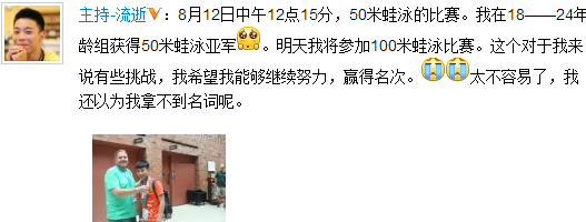 12日,他传出捷报:“8月12日中午12点15分,50米蛙泳的比赛。我在18—24年龄组获得50米蛙泳亚军。明天我将参加100米蛙泳比赛。这个对于我来说有些挑战,我希望我能够继续努力,赢得名次。太不容易了,我还以为我拿不到名次呢。”