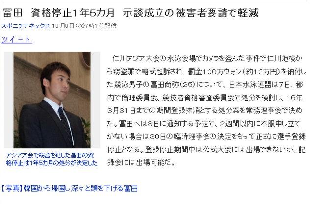【导读】2014年10月8日,日本泳联公布了对在仁川亚运会上因盗窃韩国媒体记者的相机遭到起诉的游泳选手富田尚弥的处分决定:取消其选手登录资格至2016年3月31日,这也意味着富田将被禁赛1年零5个月的时间。