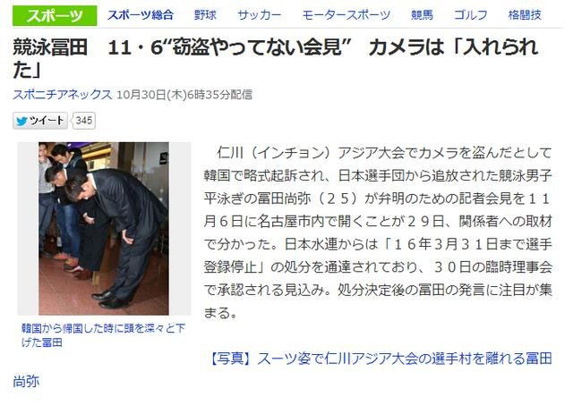 10月30日讯 韩国仁川亚运会上,因偷盗韩国媒体记者的相机而被开除出日本代表团的游泳选手富田尚弥声称自己是被栽赃的“相机是被别人放入我的包里的”,他计划11月6日在名古屋市举行记者会,届时是否会公开说明“冤情”,引人关注。