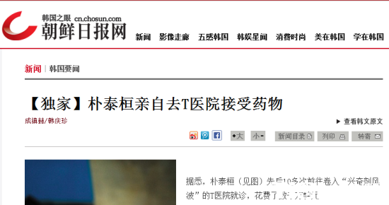 A某说:“有两次(2013年11月、2014年7月)和朴泰桓一起去了医院,在外面也经常见面。朴泰桓说过‘接受治疗后身体好转’、‘身体状态很好’。”A某上月29日接受检方调查时,被问及“介绍朴泰桓去医院时收了多少中介费”,A某回答说:“我不是中介,没收过介绍费。”